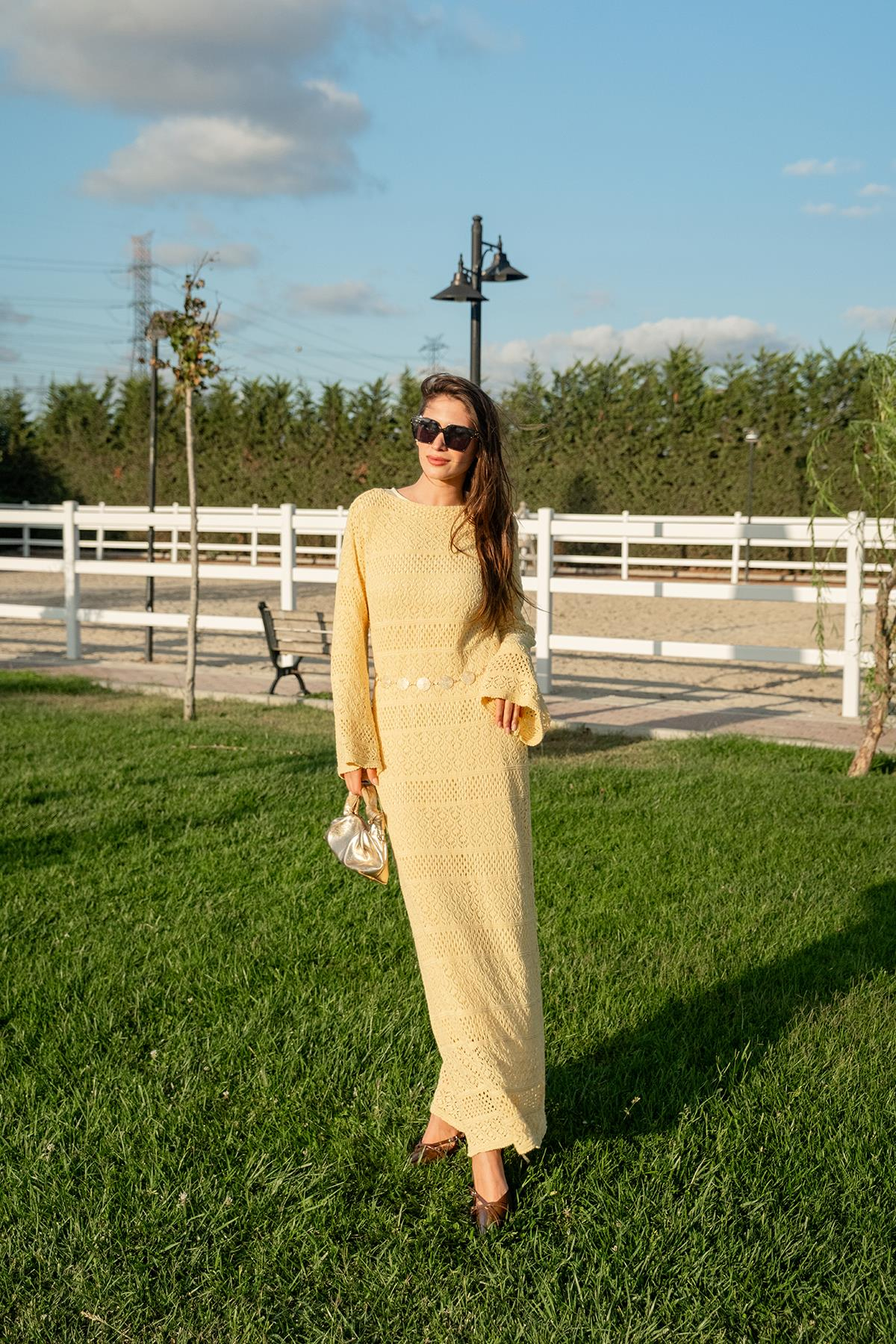 Ajur Kendinden Desenli Elbise Sarı