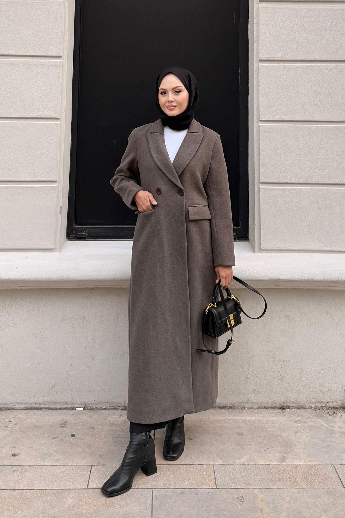 Arka Düğme Detaylı Kaşe Kaban Kahverengi