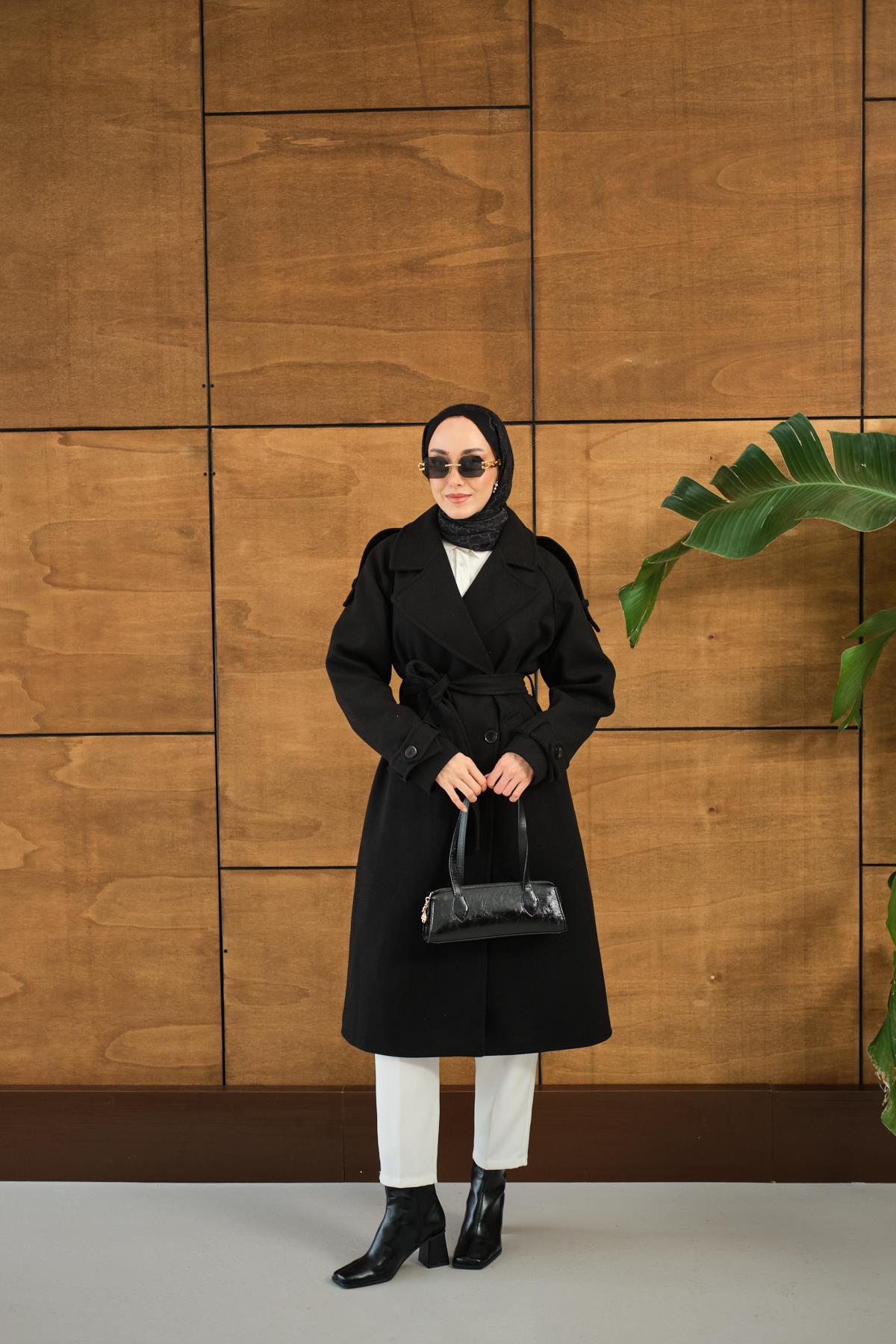 Düğme Detay Bel Bağlamalı Kaban Siyah