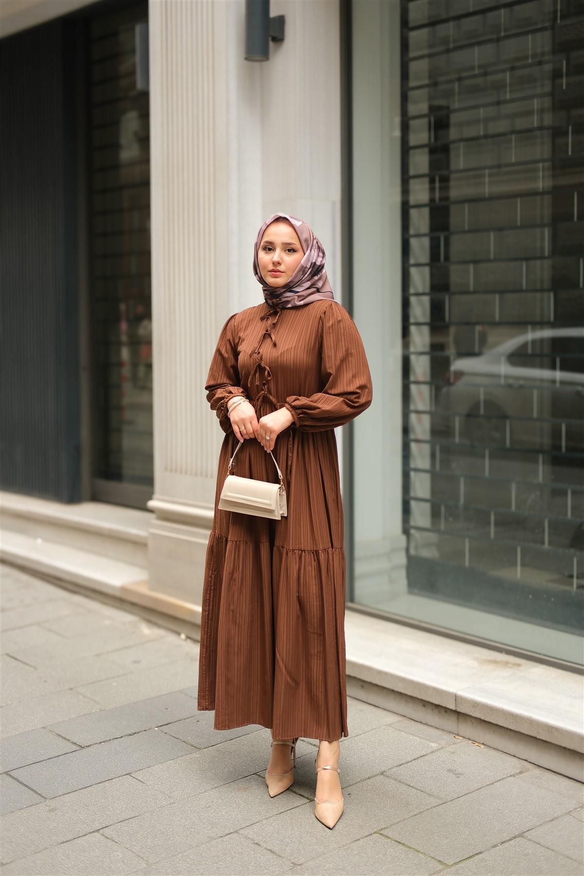 Bel Büzgülü Elbise Kahverengi