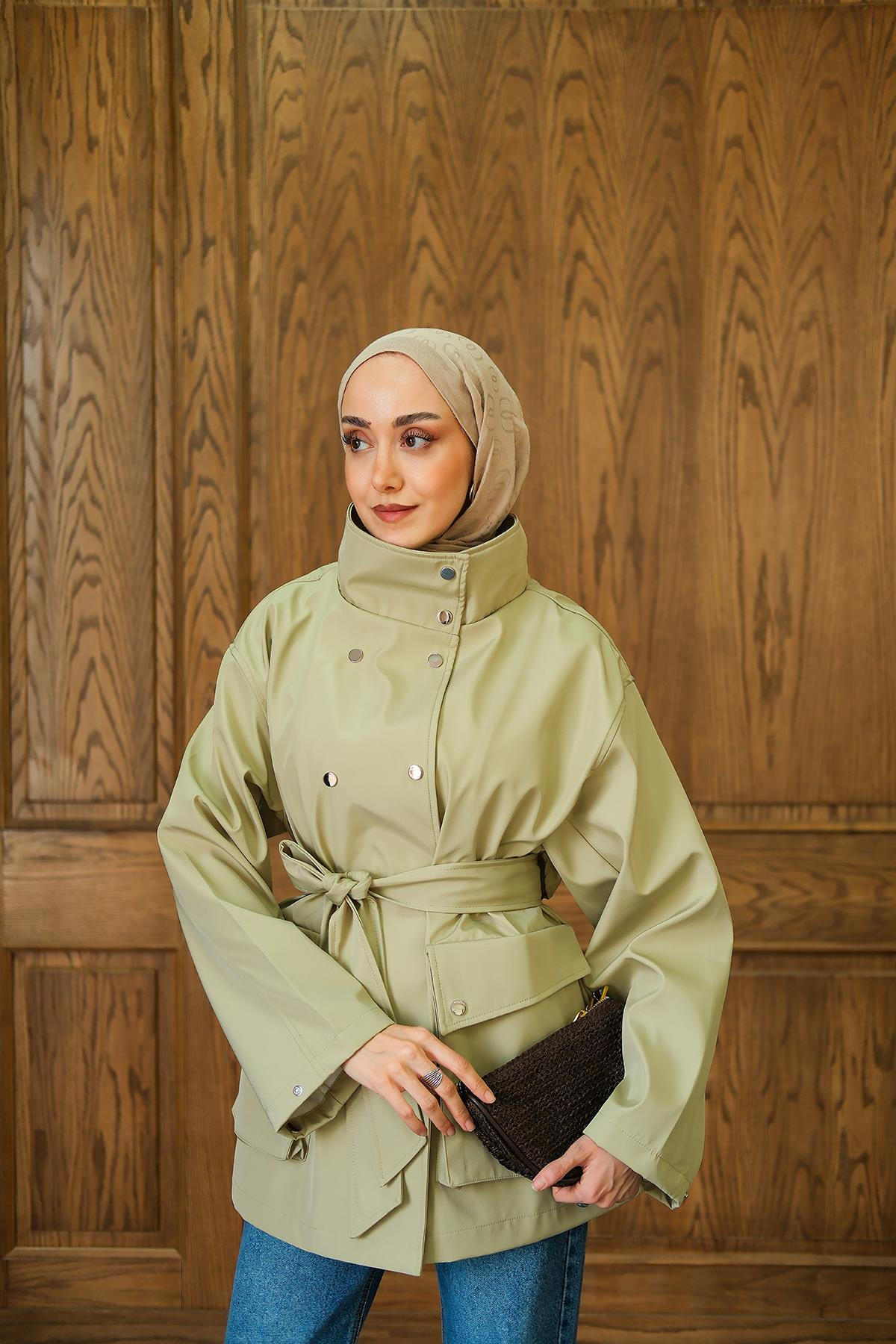 Deri Görünümlü Kısa Trenç Açık Yeşil
