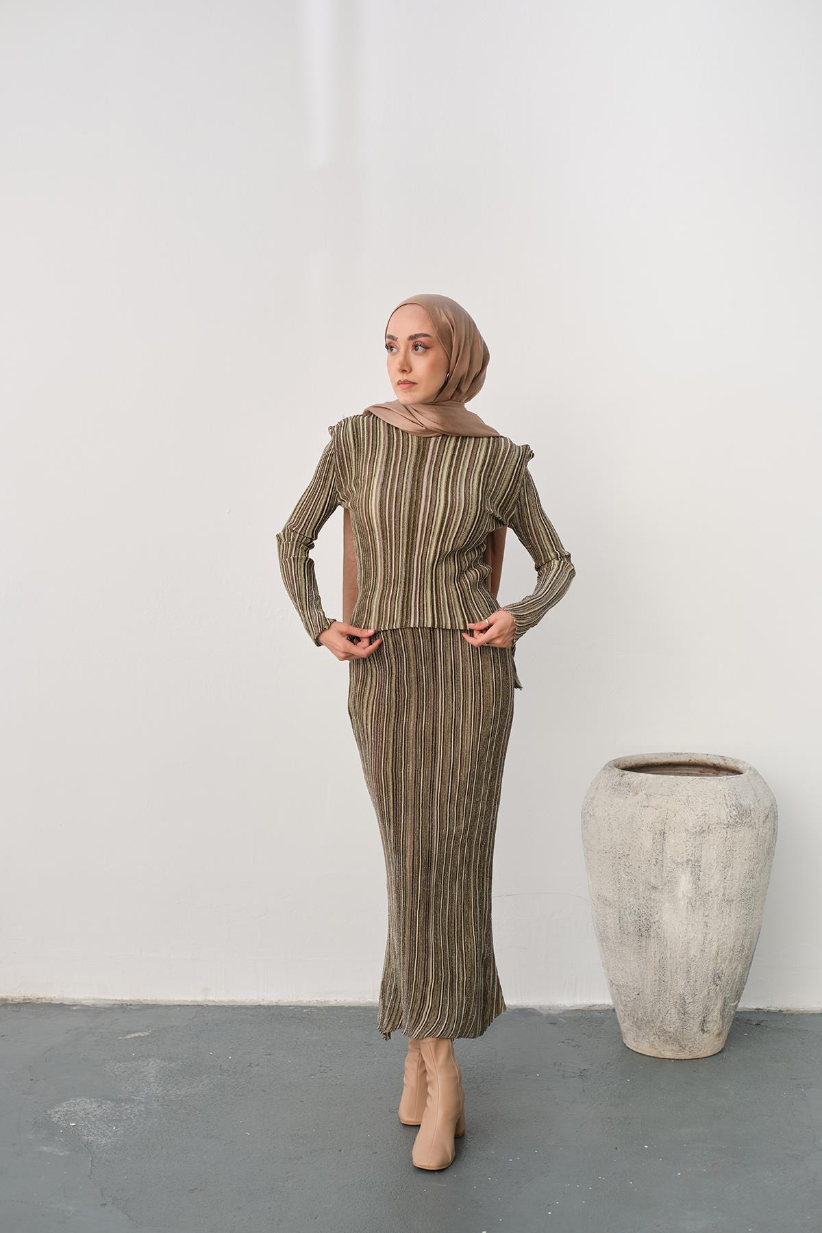 Simli Çizgi Desen Etekli Takım Yağ Yeşil