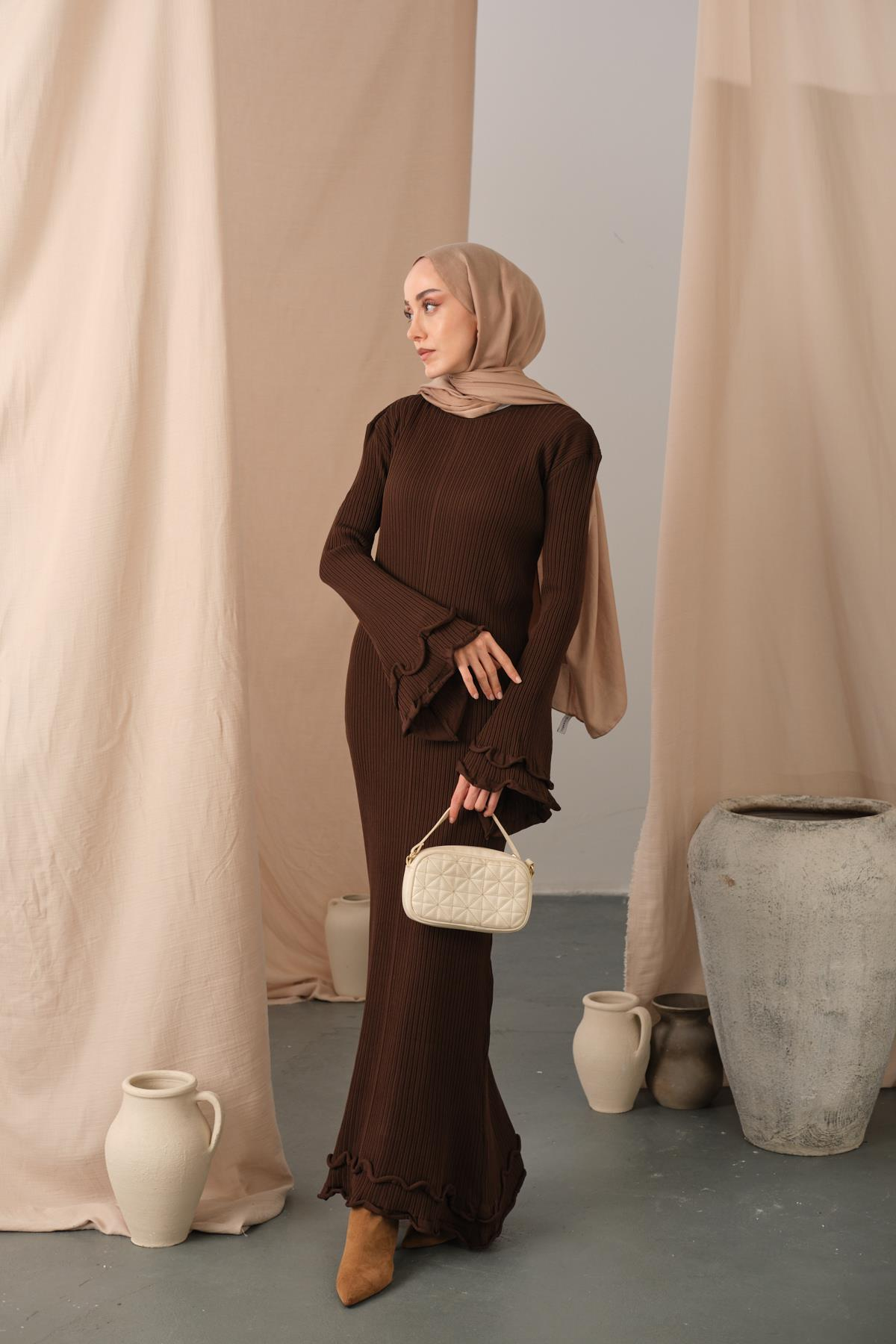 Fırfır Detay Elbise Kahverengi