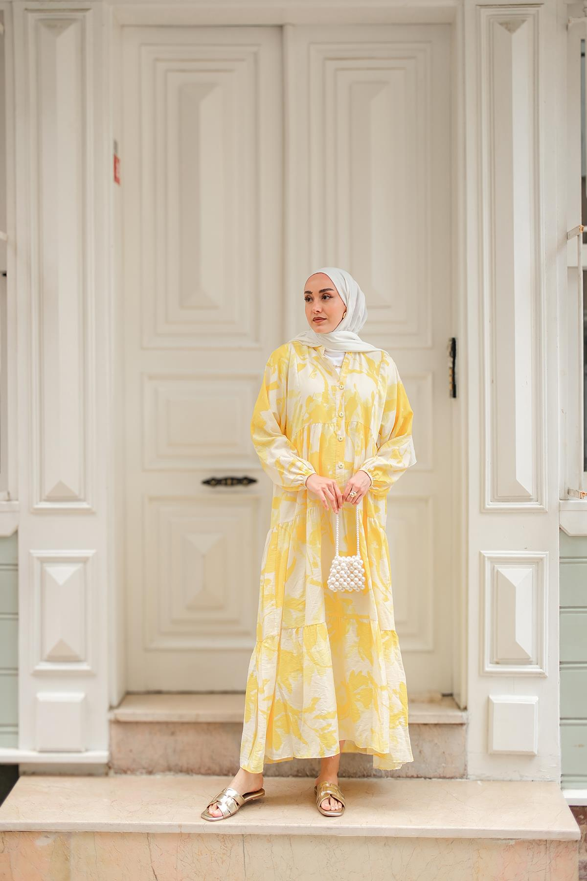Karışık Desen Elbise Sarı