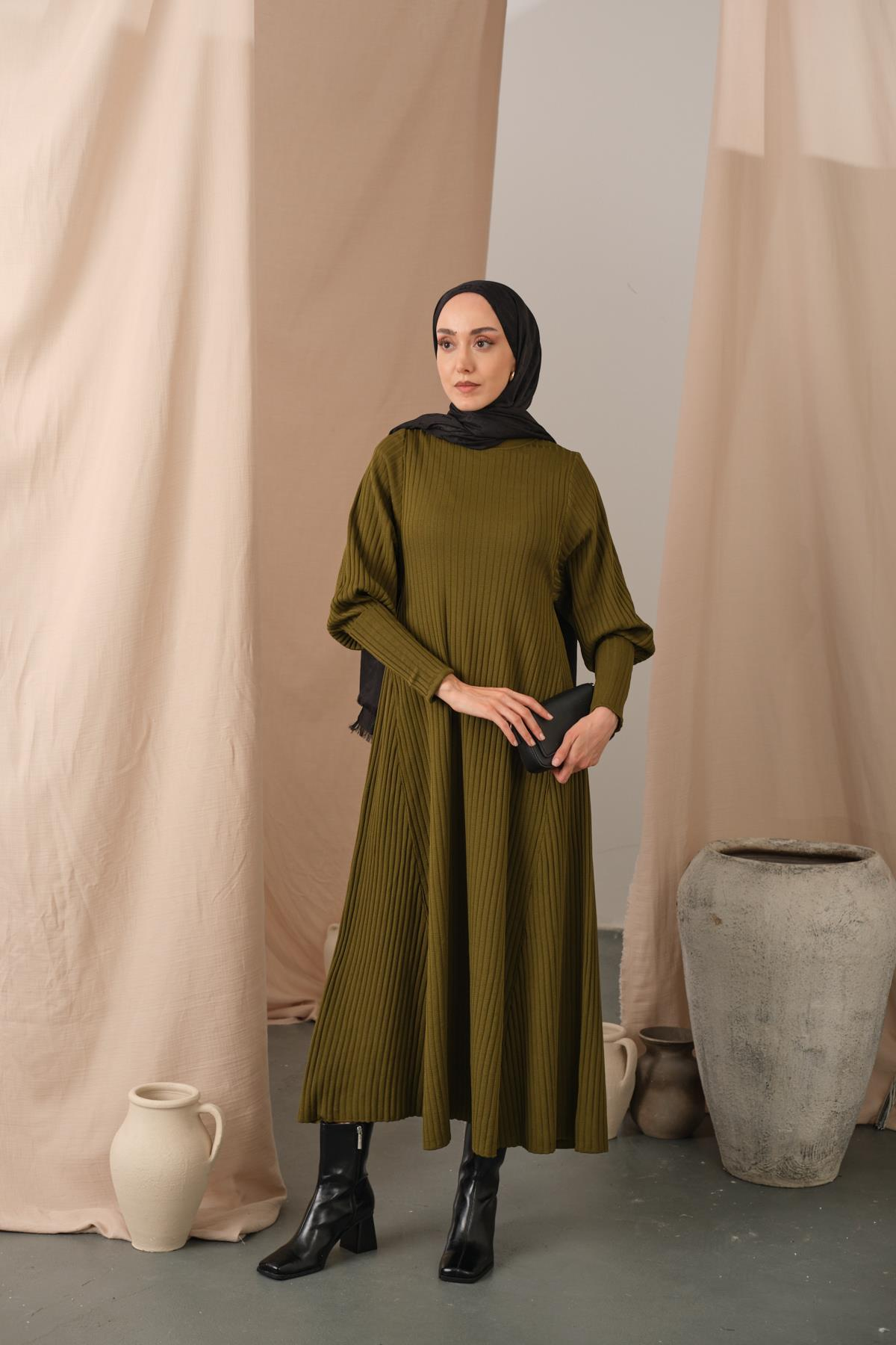 Kendinden Desenli Triko Elbise Yağ Yeşil