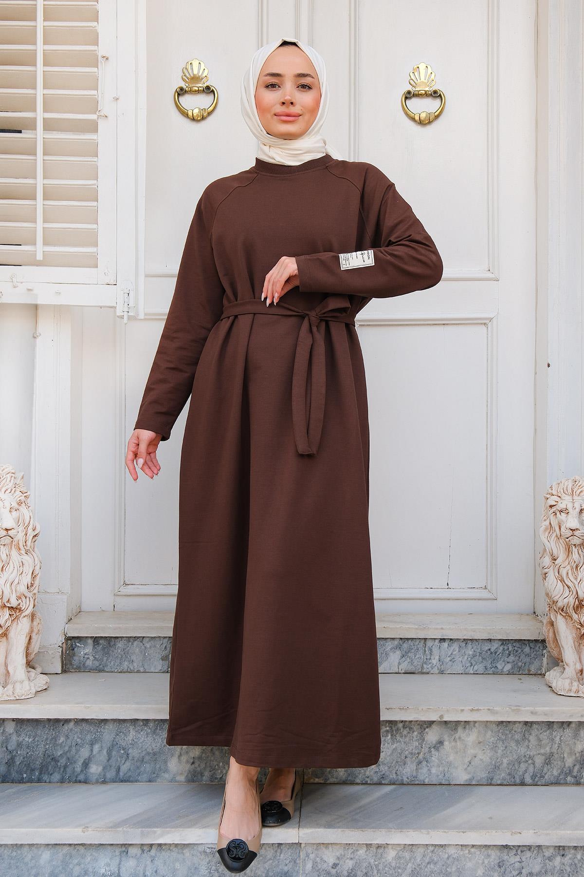 Kol Arma Detaylı Bisiklet Yaka Elbise Kahverengi