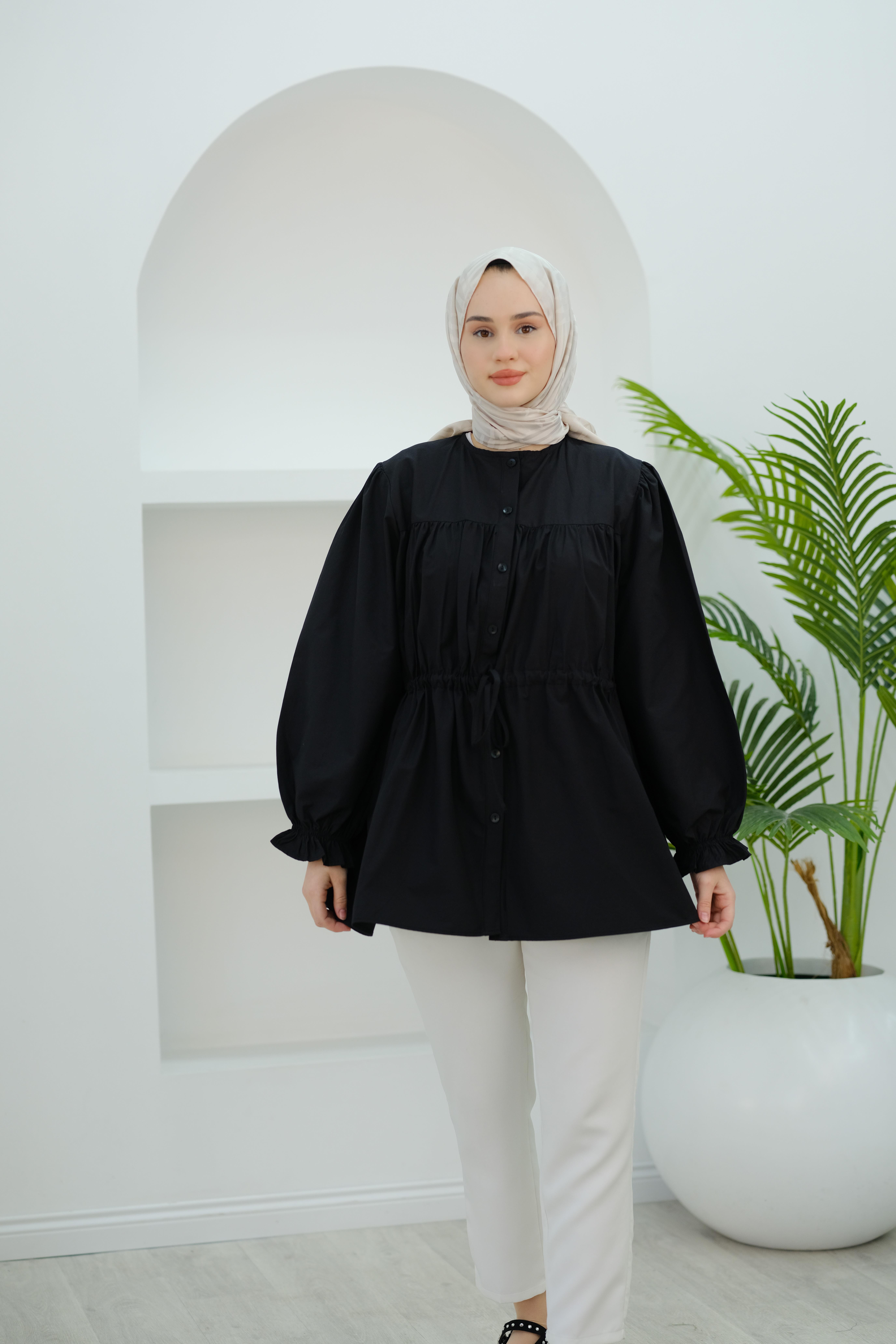 Robadan Büzgü Detaylı Balon Kol Gömlek Siyah