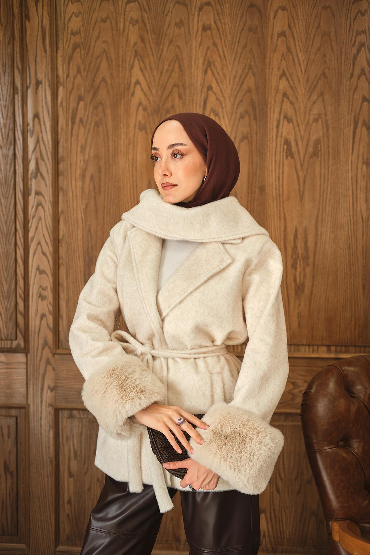 Yaka Fiyonklu Kürklü Kaşe Krem